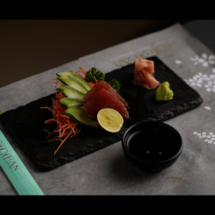 Assorted sashimi platter 12pc, fresh tuna, crab stick, salmon, red snapper, prawn
