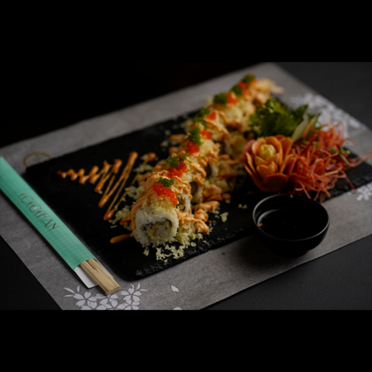 Dynamite maki, prawn tempura, tempura flakes, tobico, teriyaki sauce