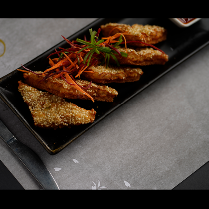 Crispy prawn on toast, sesame seeds, served with chilli oil